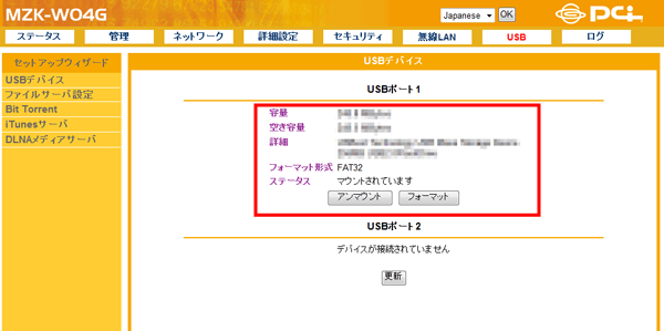 接続している外付けハードディスクを「FAT32」形式または「EXT3」形式にフォーマットすることができます。