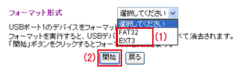 - 「フォーマット形式」のプルダウンリストから「FAT32」または「EXT3」を選択し、をクリックします。