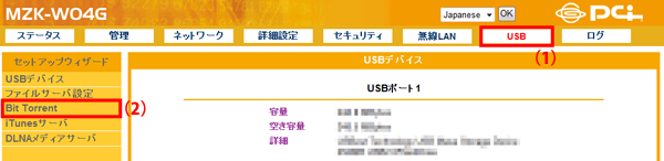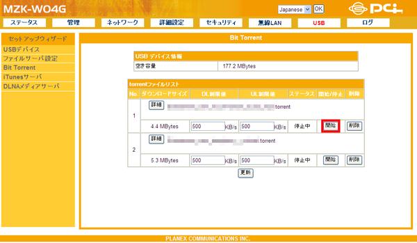 設定画面で「USB」−「Bit Torrent」をクリックして、「Bit Torrent」画面を表示させます。 ※設定画面の表示方法についてはこちらを参照してください。 ▼ Torrentファイルリストが表示されます。 ※Torrentファイルが多いとき、Torrentファイルリストの表示に時間がかかる場合があります。