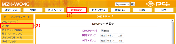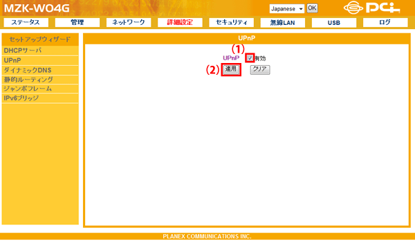 設定画面で「詳細設定」−「UPnP」をクリックして、「UPnP」設定画面を表示させます。