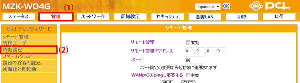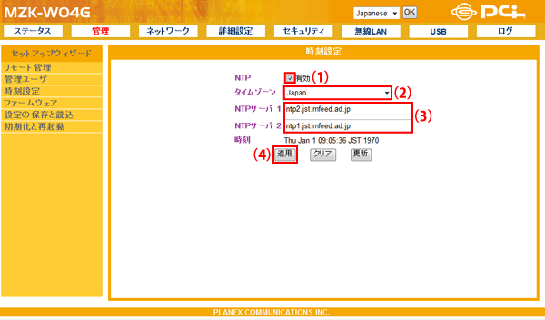 設定画面で「管理」−「時刻設定」をクリックして、「時刻設定」画面を表示させます。 ※設定画面の表示方法についてはこちらを参照してください。
