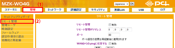 設定画面で「管理」−「リモート管理」をクリックして、「リモート管理」画面を表示させます。 ※設定画面の表示方法についてはこちらを参照してください。