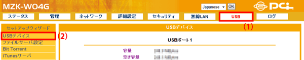 設定画面で「USB」−「USBデバイス」をクリックして、「USBデバイス」設定画面を表示させます。 ※設定画面の表示方法についてはこちらを参照してください。