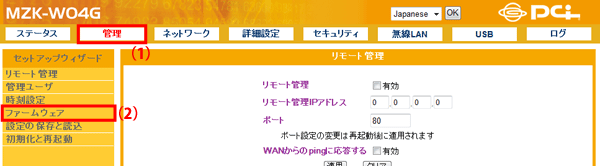 設定画面で「管理」−「ファームウェア」をクリックして、「ファームウェア」画面を表示させます。