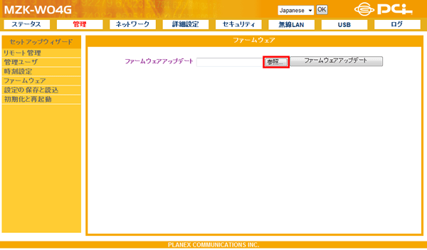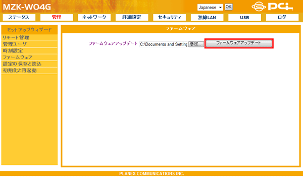 ファームウェアのアップデート方法を説明します。弊社のホームページより最新のファームウェアがあるときはダウンロードできます(http://www.planex.co.jp/support/download/)。