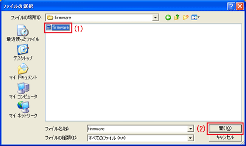 保存した新しいファームウェアファイルの場所を指定し、[開く]をクリックします。