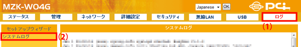 設定画面で「ログ」−「システムログ」をクリックして、「システムログ」画面を表示させます。