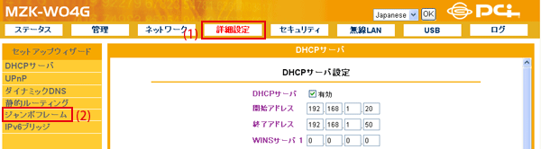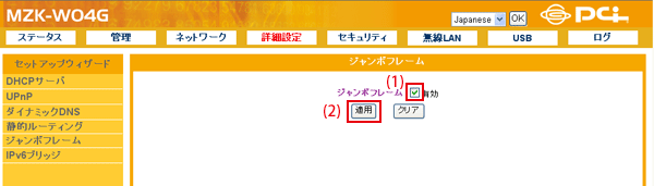 設定画面で「詳細設定」−「ジャンボフレーム」をクリックして、「ジャンボフレーム」設定画面を表示させます。