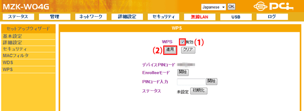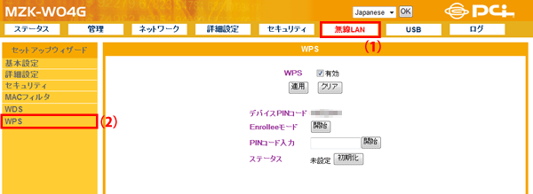 (1)本製品の設定画面で「無線LAN」−「WPS」をクリックして、「WPS」画面を表示させます。