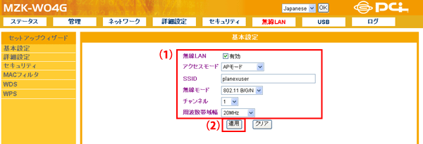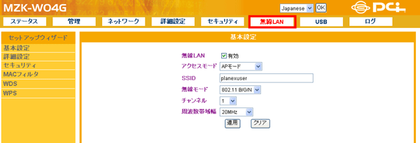 設定画面で「無線LAN」をクリックして、「基本設定」画面を表示させます。