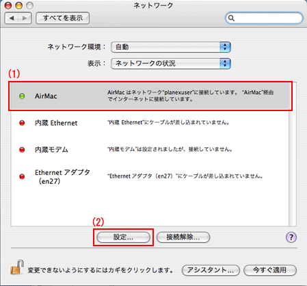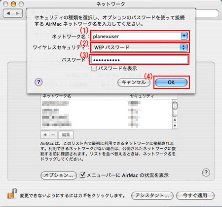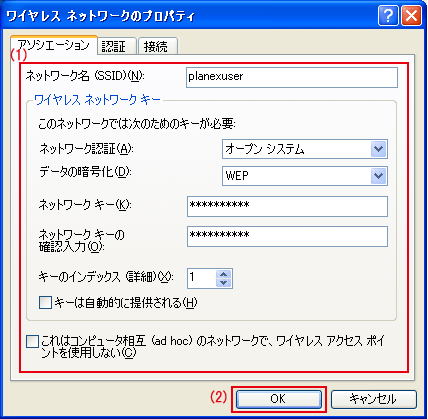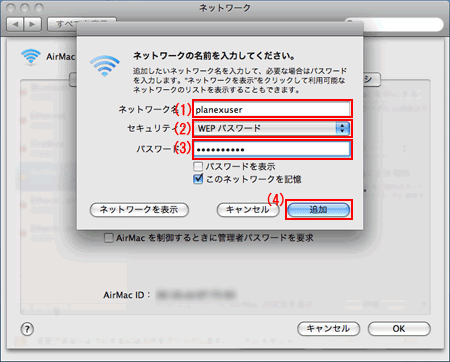 (1)「ネットワーク名(SSID)」に「planexuser」を入力します。