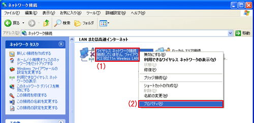 (1)「ワイヤレスネットワーク接続」を右クリックします。