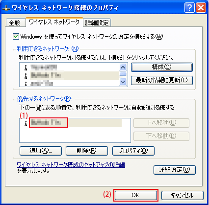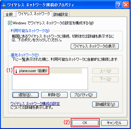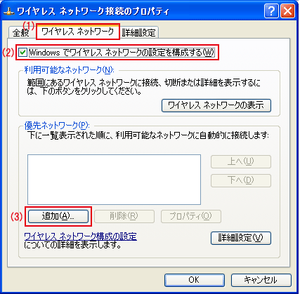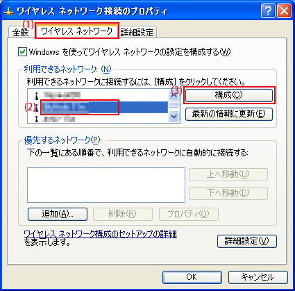 (2)「Windowsでワイヤレスネットワークの設定を構成する」のチェックをオンにします。