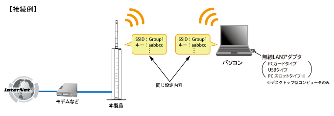 本製品の初期値を無線設定として使用するときは、以下の表を参考にして、無線LANアダプタに設定してください。