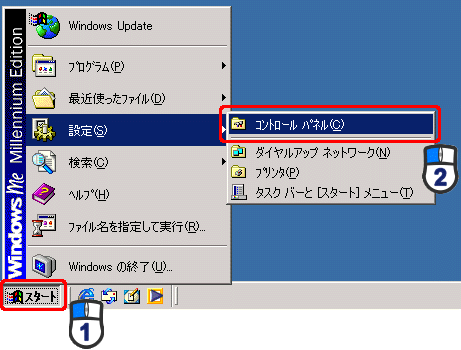 「スタート」→「設定」→「コントロールパネル」をクリックします。