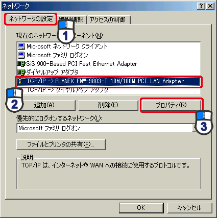 ※ここではLANカードに「PLANEX FNW-9803-T 10M/100M PCI LAN Adapter」を使用しています。