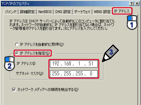 (3)「IPアドレス」に「192.168.1.x」(xは2〜19、51〜254の任意の値。パソコンのときは51〜99を推奨)と入力します※。「サブネットマスク」に「255.255.255.0」と入力します。