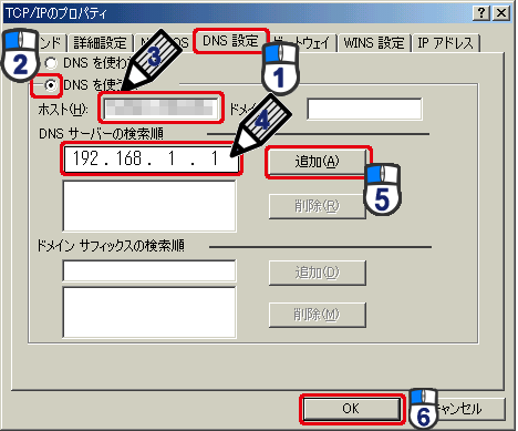 (4)「DNSサーバーの検索順」に「192.168.1.1」と入力します。