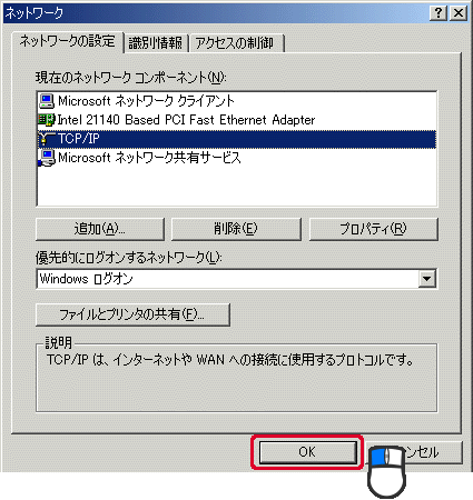 (2)「現在のネットワークコンポーネント」から「TCP/IP → お使いのLANカード(またはLANボード)」を選びます※。