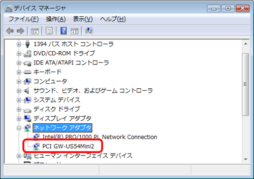 ネットワークアダプタのところに、お使いの無線LANアダプタが表示されるか確認します。
