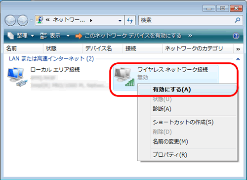 - 以下のように、「ワイヤレスネットワーク接続」が無効になっているときは、「ワイヤレスネットワーク接続」のアイコンを右クリックし、「有効にする」をクリックします。