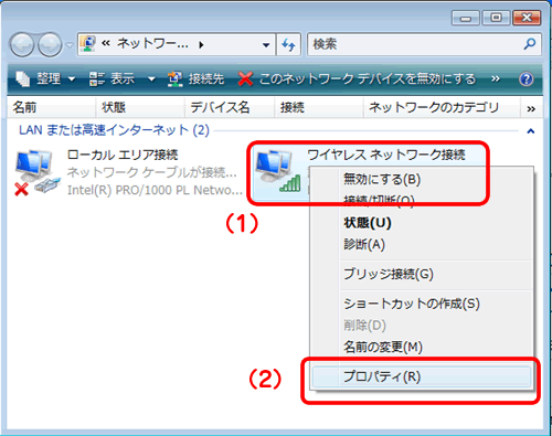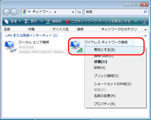 設定方法は、取り外せるアダプタであれば取り外していただくか、内蔵のアダプタであれば、以下の手順を参照し、「ワイヤレスネットワーク接続」を無効にしてください。