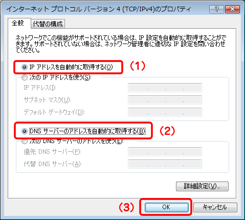 - 「IPアドレスを自動的に取得する」と「DNSサーバのアドレスを自動的に取得する」を選び、