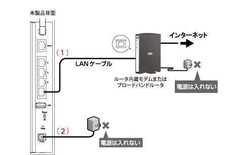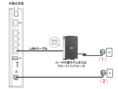 (1)ルータ内蔵モデムまたはブロードバンドルータ → (2)本製品の順に電源を入れます。