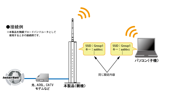 無線LANパソコンの無線設定を本製品と同じにすることで通信できるようになります。