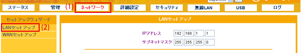 「ネットワーク」→「LANセットアップ」をクリックします。