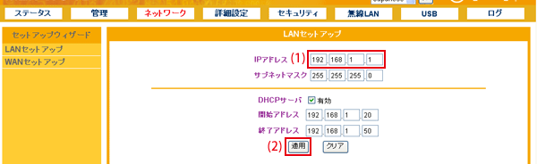 「IPアドレス」に「192.168.1.1」を入力し、[適用]をクリックします。