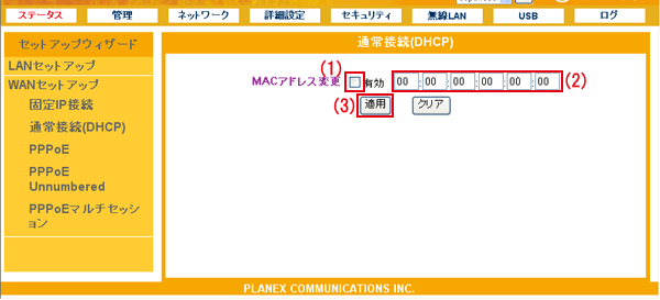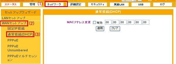 設定画面で「ネットワーク」−「WANセットアップ」−「通常接続(DHCP)」をクリックして、「通常接続(DHCP)」設定画面を表示させます。 ※設定画面の表示方法についてはこちらを参照してください。