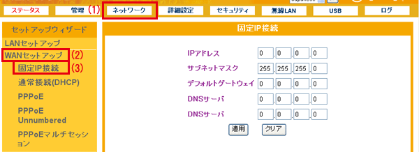 設定画面で「ネットワーク」−「WANセットアップ」−「固定IP接続」をクリックして、「固定IP接続」設定画面を表示させます。 ※設定画面の表示方法についてはこちらを参照してください。