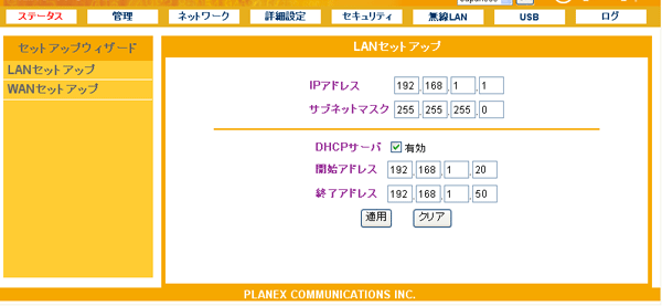DHCPサーバ機能を有効にするとき、「有効」にチェックします。
