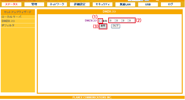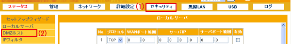 設定画面で「セキュリティ」−「DMZホスト」をクリックして、「DMZホスト」設定画面を表示させます。 ※設定画面の表示方法についてはこちらを参照してください。