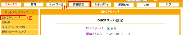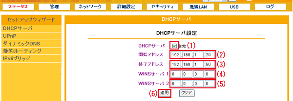DHCPサーバの設定をします。ここで指定した範囲内のIPアドレスがクライアントに対して自動的に付与されます。
