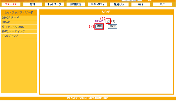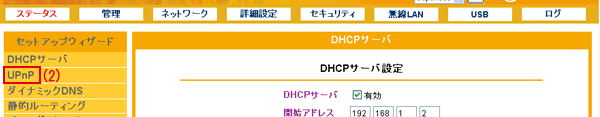 設定画面で「詳細設定」−「UPnP」をクリックして、「UPnP」設定画面を表示させます。