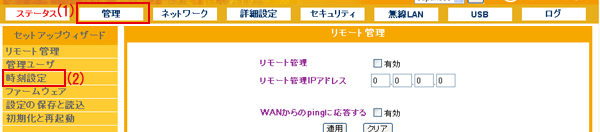 設定画面で「管理」−「時刻設定」をクリックして、「時刻設定」画面を表示させます。 ※設定画面の表示方法についてはこちらを参照してください。