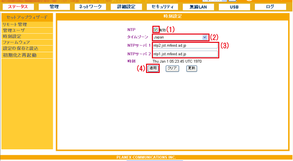 (3)NTPサーバのドメインを入力します。 最大2つまで設定できます。
