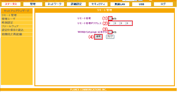 設定画面で「管理」−「リモート管理」をクリックして、「リモート管理」画面を表示させます。 ※設定画面の表示方法についてはこちらを参照してください。