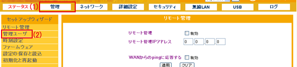 設定画面で「管理」−「管理ユーザ」をクリックして、「管理ユーザ」画面を表示させます。 ※設定画面の表示方法についてはこちらを参照してください。