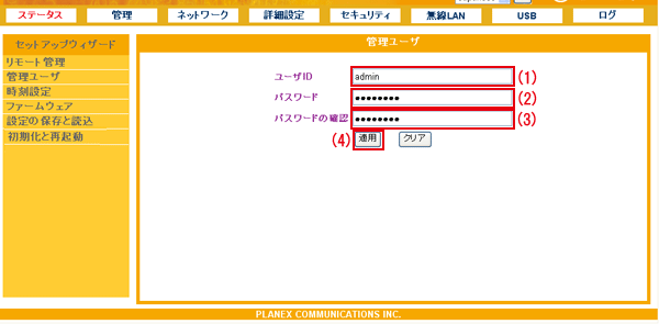 (1)任意のユーザIDを半角英数字63文字以内で入力します。 初期設定は「admin」です。