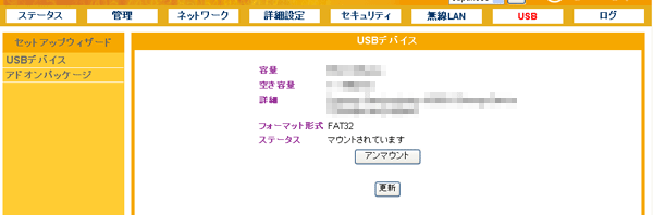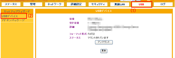 設定画面で「USB」−「USBデバイス」をクリックして、「USBデバイス」画面を表示させます。 ※設定画面の表示方法についてはこちらを参照してください。