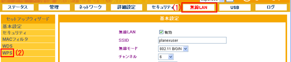 設定画面で「無線LAN」−「WPS」をクリックして、「WPS」画面を表示させます。