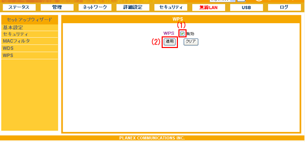 (1)WPS機能を有効にするときは、チェックボックスをクリックして、チェックマークをつけます。