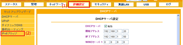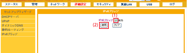 設定画面で「詳細設定」−「IPv6ブリッジ」をクリックして、「IPv6ブリッジ」設定画面を表示させます。