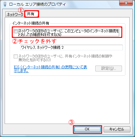 共有タブをクリックし、「ネットワークのほかのユーザーに、このコンピュータのインターネット接続をとおしての接続を許可する」のチェックを外し、[OK]をクリックしてください。