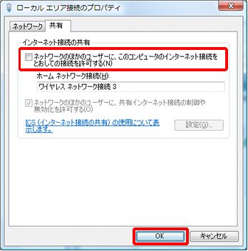 「ネットワークのほかのユーザーに、このコンピュータのインターネット接続をとおしての接続を許可する」のチェックをはずし、